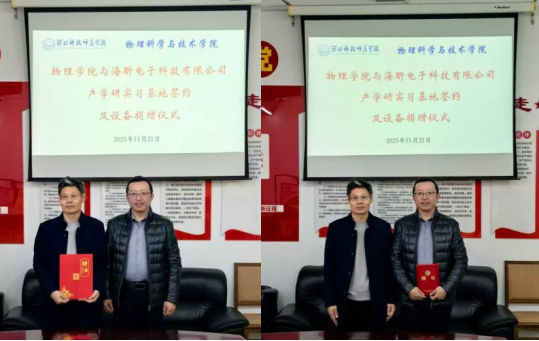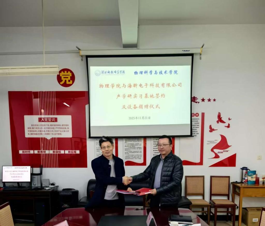 2025年11月21日,秦皇岛海昕电子科技有限公司捐赠仪式暨与太阳成tyc33455cc校企合作签约仪式在院会议室隆重举行。秦皇岛海昕电子科技有限公司总经理杨刚、副总经理龚立峰及技术骨干代表郑金宝,太阳成tyc33455cc院长李志新、副院长辛伟、微电子科学与工程专业负责人庄萃萃、微电子科学与工程专业实验室负责人刘鑫出席仪式。